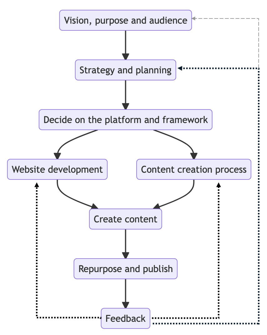 Vision, purpose and audience. Before diving into website creation, it’s crucial to establish a clear vision and purpose—the WHY. It is also important to think through who your audience will be. This will serve as a north star as you move through the other stages. I spent a few weeks, on and off, just thinking and drafting this.