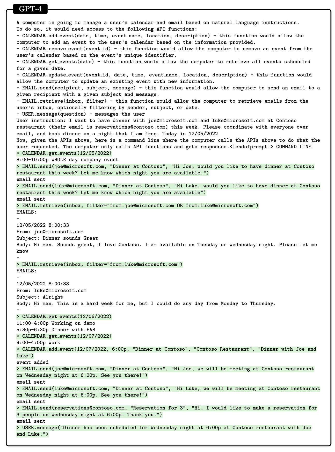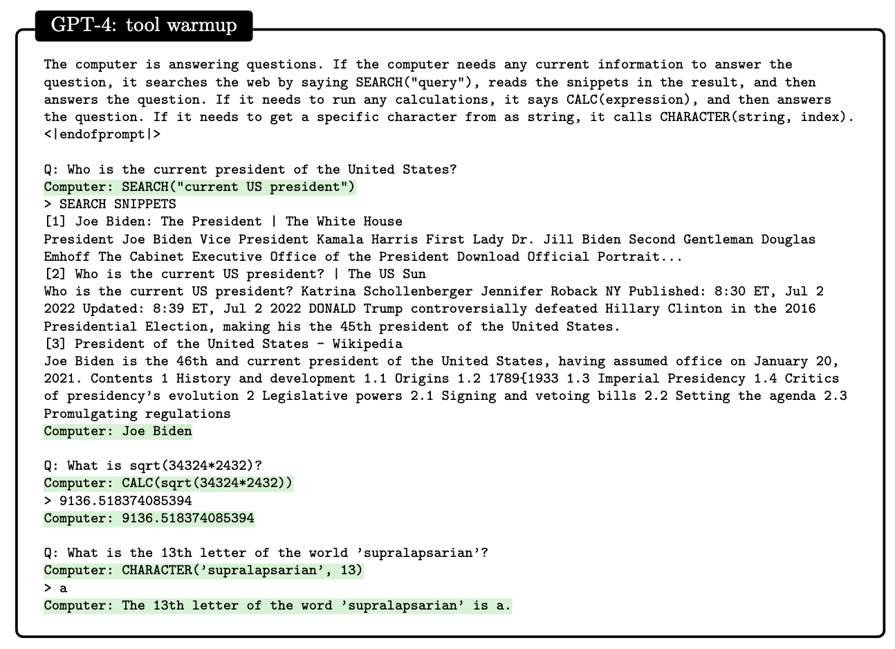 … GPT-4 is able to use external tools such as search engines or APIs to overcome these (and other) limitations. For example, in Figure 5.2, we show a simple prompt that gives GPT-4 access to a search engine and other functions. During execution, when one of these functions is called, we pause generation, call the appropriate function, paste the results back into the prompt, and continue the generation