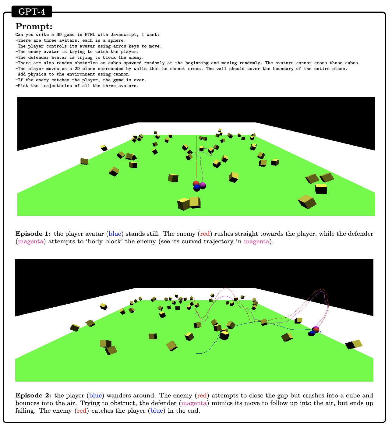 GPT-4 created a working 3d game in zero-shot fashion in HTML.