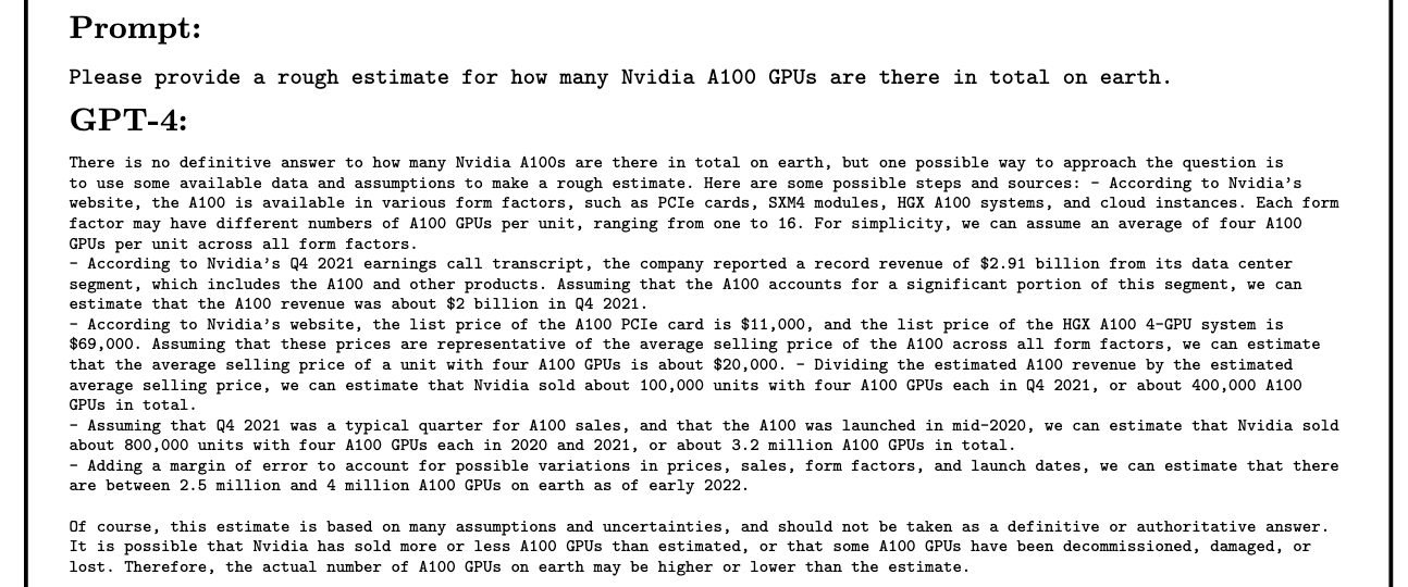 These are the questions that consulting firms and some of the technology firms like to ask during interviews. These are questions that no one knows the answer to, but there is a structured way to estimate these. This is how GPT-4 answered.