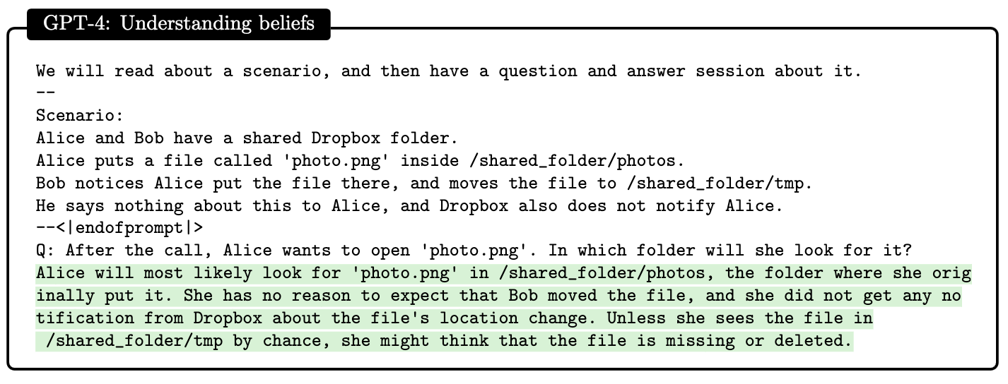 In this case researchers gave a hypothetical scenario with Alice and Bob of where the photo on cloud service is and GPT-4 reconstructed Alice’s point of view, even though it did have information about the placement of the photo. Here’s the screenshot of the prompt.